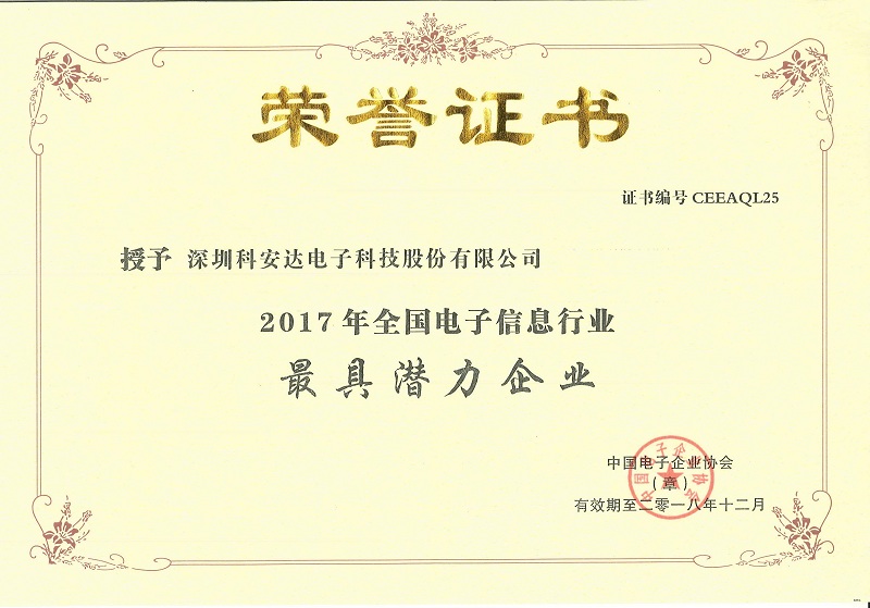 本次科安達憑借領(lǐng)先的技術(shù)創(chuàng)新能力、巨大的發(fā)展?jié)摿推放朴绊懥?,榮獲“2017年全國電子信息行業(yè)優(yōu)秀企業(yè)-最具潛力企業(yè)”獎項。本次獲獎企業(yè)還包括上海儀電集團、天津中環(huán)集團、海信電器、海康威視等優(yōu)秀企業(yè),涵蓋電子信息產(chǎn)業(yè)完整產(chǎn)業(yè)鏈,是國內(nèi)電子信息行業(yè)各領(lǐng)域領(lǐng)軍企業(yè)的集體展示與高層交往盛會。